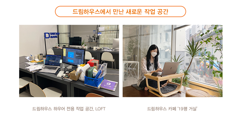 새로운 공간에 대한 관심도 빠질 수가 없는데요, 저는 특정 공간과 그 안에서 일어나는 교류에 대한 호기심, 갈증이 항상 있었습니다. 그래서 기회가 생기면 최대한 경험을 해보는 쪽을 택했고, 드림하우스에 입주한 것도 그러한 이유에서였습니다. 그런데 직원으로서는 삶의 상당 시간을 일정한 공간에 있어야 하는 것 또한 하나의 의무였기 때문에, 내가 일할 공간을 직접 결정할 수 있는 프리랜서가 되어보자고 생각했습니다. 초반에는 아예 정해진 공간이 없는 디지털노마드가 적성에 맞는 줄 알았으나, 매일 무거운 짐을 들고 앉을 곳을 찾아다니는 것도 쉬운 일은 아니었습니다. 그리고 직업의 특성상 3D 형상을 만들거나 오랜 시간 렌더링을 걸어야 할 때도 있어 오히려 비효율적이었죠. 그래서 개인 작업실을 구축하여 정해진 시간에 출근하는 형태로 일을 하지만, 창의적인 아이디어를 내야 하거나 가벼운 도구만 필요한 날에는 적극적으로 외부로 나가 작업을 하고 있습니다. 드림하우스에 입주하고 나서는 하우어 전용 작업 공간인 LOFT와 카페 19평 거실에서 작업하는 시간이 많아졌습니다. 개인적으로 애착이 많은 연남동에서 한 분 한 분 존경스러운 하우어들과 살아가고 있는 요즘이, 제가 바라고 있던 삶인 것 같습니다.