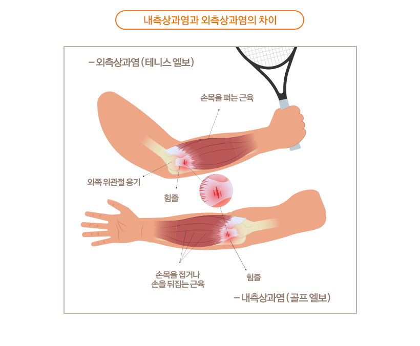 골프를 할 때 많은 부상이 있는 내측상과염과 테니스를 할 때 많이 다치는 외측상과염은 어떤 차이가 있을까요? 한마디로 정리하면 내측상과염(골프 엘보)은 손목 굴곡근의 힘줄 손상으로 발생하는 경우가 많은데요. 주로 손을 비트는 동작을 할 때 팔꿈치 안쪽에서 통증이 느껴집니다. 외측상과염(테니스 엘보)은 손목 신전근의 힘줄 손상으로 발생하며, 팔꿈치 바깥쪽을 눌렀을 때 통증이 느껴집니다. 사실 이름으로는 내측과 외측으로 나뉘어 있지만 팔을 많이 사용하게 되면 동시에 나타나는 증상이며, 운동선수뿐만 아니라 설거지나 수건, 걸레를 쥐어짜는 행동들을 많이 하는 전업주부분들에게도 발생합니다.