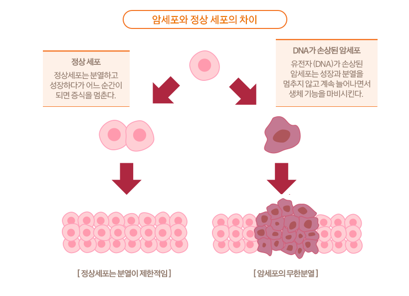 암이란 무한정으로 증식하면서 주위의 조직이나 장기를 침윤하는 특징을 가진 세포로, 크기와 형태가 다양하게 나타납니다. 정상적인 세포의 경우, 일정한 주기로 분열과 괴사를 반복하고, 분열 시 염색체의 텔로미어가 짧아지면서 분열을 멈추게 됩니다. 반면에 암세포의 경우에는 주위에 있는 모든 에너지를 끌어다 자신의 증식에만 사용하게 되는 DNA의 돌연변이라고 볼 수 있습니다.