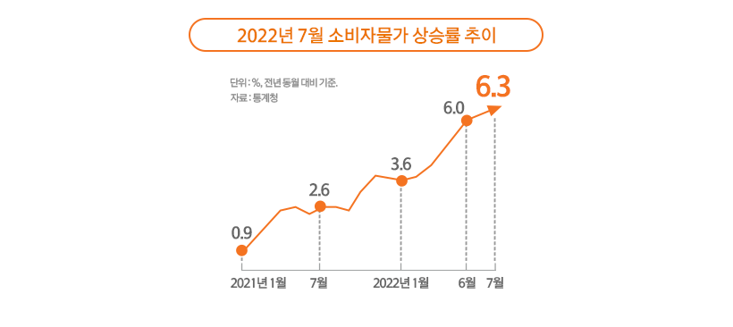통계청이 지난 2일 발표한 ‘7월 소비자물가동향’에 따르면 2022년 7월 소비자물가지수는 108.74로, 1년 전 보다 무려 6.3% 증가했습니다. 하지만 이 6.3%라는 상승률이 얼마나 많이 오른 것인지 한 번에 체감하기는 어려운데요.