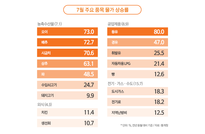 석유류는 올해 들어 처음으로 전월보다 상승 폭이 둔화됐지만, 등유(80%), 경유(47%), 휘발유(25.5%) 등 평균 값이 35.1%나 인상되었습니다.
