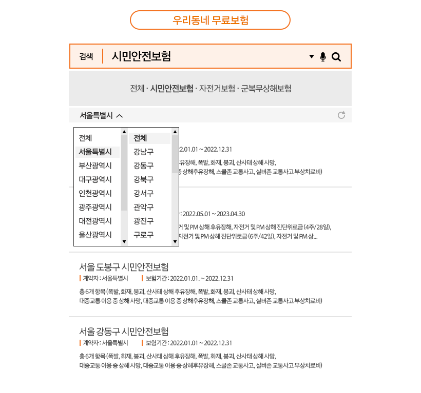내가 거주하고 있는 지자체에서 어떤 보험에 가입했는지 알고 싶다면, 검색창에 시민안전보험을 검색하면 되는데요. 시군구에 따라 가입한 보험 내역을 자세히 알 수 있습니다.