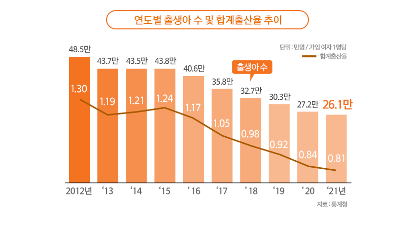 청년들 사이에서 딩크족과 비혼주의가 늘어나면서, 2021년 대한민국의 합계출산율이 0.81명을 기록해 다시 한번 역대 최저 출산율을 갱신했습니다. 정부에서는 계속해서 떨어지는 출산율을 높이기 위해 다양한 저출산 정책을 내놓고 있는데요.