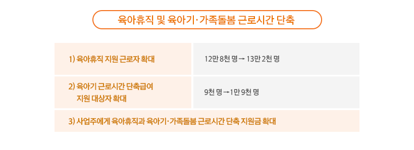 보육환경 개선 및 돌봄 관련 예산은 4,500억 원에서 5,700억 원으로 늘어나며, 육아휴직 및 육아기·가족돌봄 근로시간 단축 관련 예산은 1조 9,000억 원에서 2조 1,000억 원으로 늘어날 전망입니다.