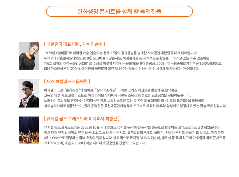 2004년부터 문화예술 저변 확대를 위해 지방도시를 순회하며 시작된 한화생명의 음악여행은 작년부터 예술성과 대중성을 더한 명작 음악회로 거듭났습니다. 올해는 국내 대표 디바 인순이와 재즈보컬리스트 윤덕현, 뮤지컬 팝스 오케스트라(지휘 최성근)와 함께 모두에게 위로와 희망을 전하는 무대를 선보일 예정입니다.