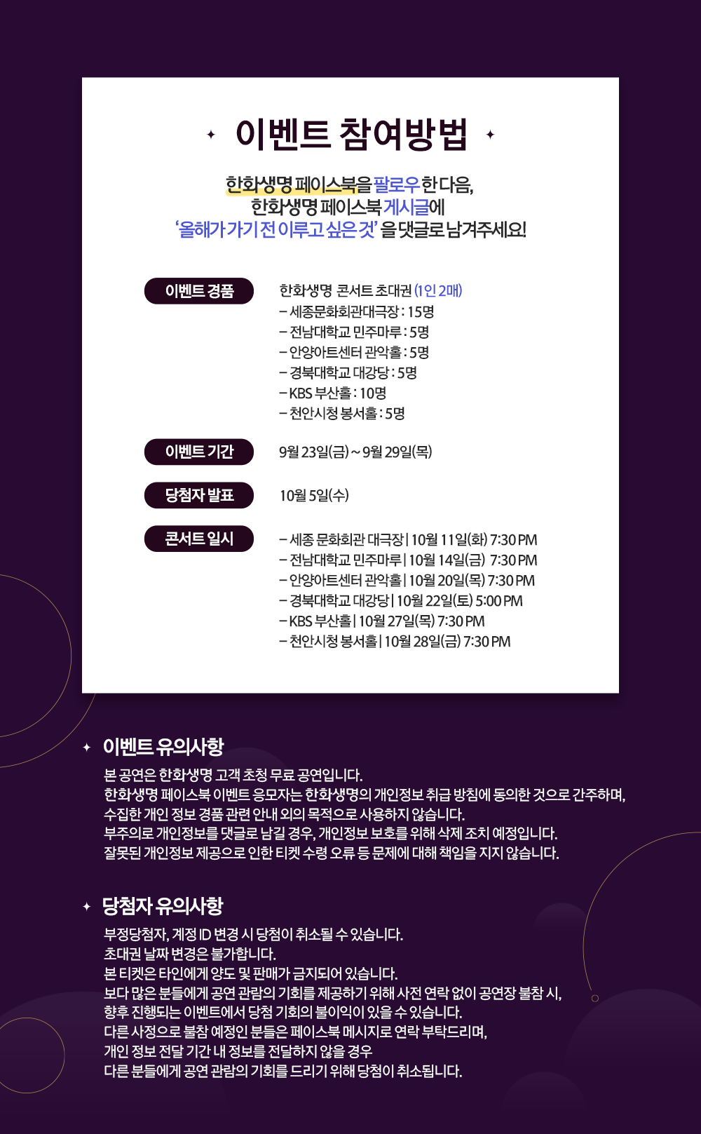 전 좌석 초대를 통해 관람이 가능한 이번 공연은 한화생명 페이스북 이벤트를 통해 응모하실 수 있습니다.