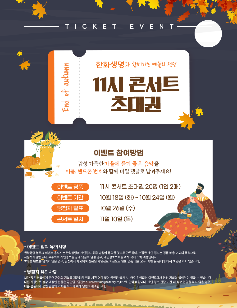 깊어가는 가을 ‘한화생명과 함께하는 예술의 전당 11월 11시 콘서트’와 소중한 사람과 함께 감성 가득한 추억을 만들어 보는 것은 어떨까요?
