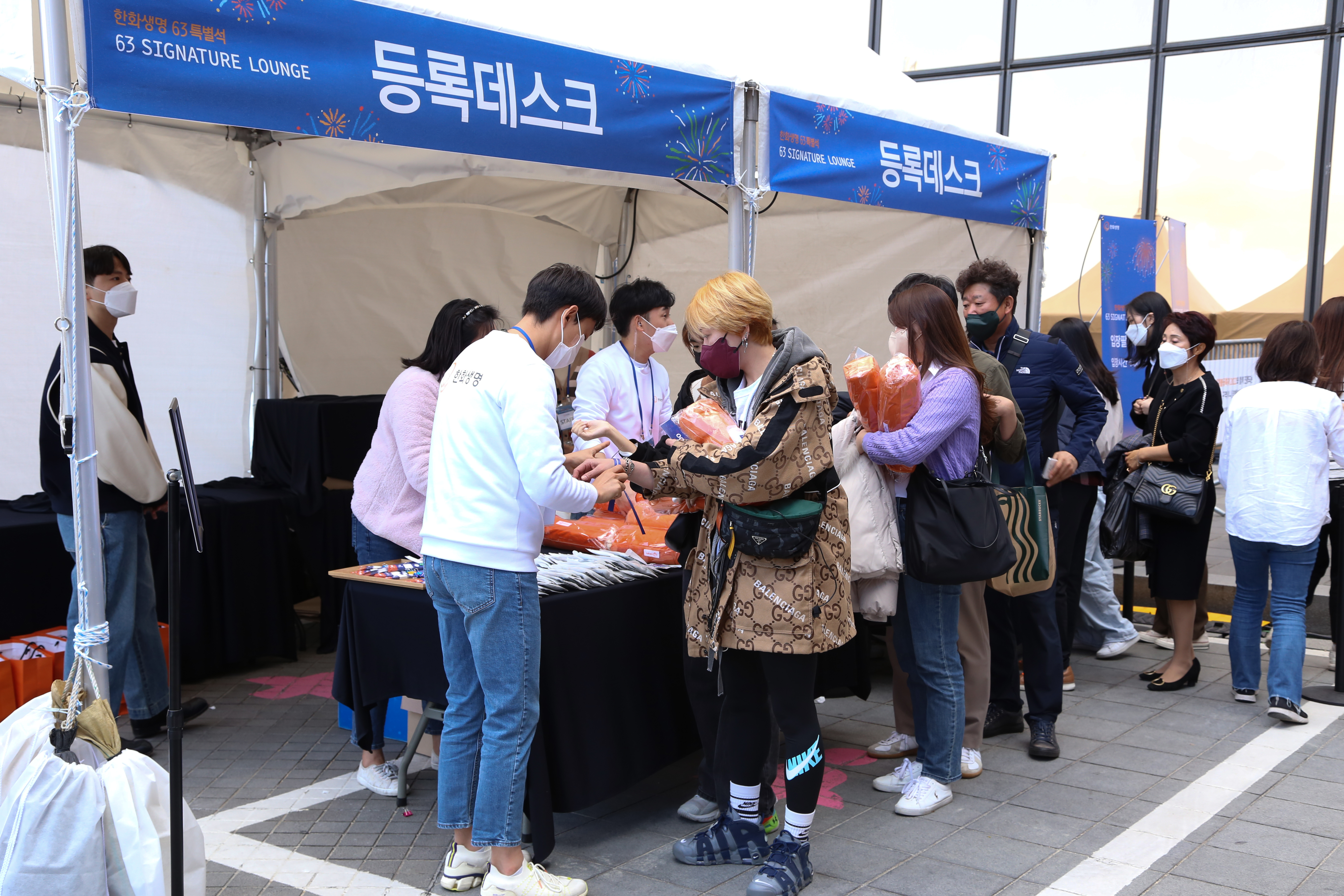오후 4시! 한화생명 63특별석 63 SIGNATURE LOUNGE의 입장이 시작됐습니다. 3년 만에 다시 개최되는 불꽃놀이에 대한 기대에 모두들 들떠 있는 모습이었는데요! 먼저 입구에서 63 SIGNATURE LOUNGE 초청 문자와 신분증 확인 후 입장 팔찌와 함께 담요, 핫팩 등 한화생명 굿즈를 받았어요. 입장 팔찌는 중간중간 화장실 등을 다녀올 때 꼭 확인해야 하니 팔에 든든히 차 주고, 갑자기 추워진 날씨에도 따듯하게 불꽃축제를 즐길 수 있도록 나눠준 핫팩과 담요로 완전 무장 후 관람 준비를 시작했습니다! 특히나 입장 때 의자에 부착할 수 있는 번호 스티커를 나눠 주어서 입장한 순서대로 원하는 자리를 잡아 두고 이동이 가능해서 편리했답니다.