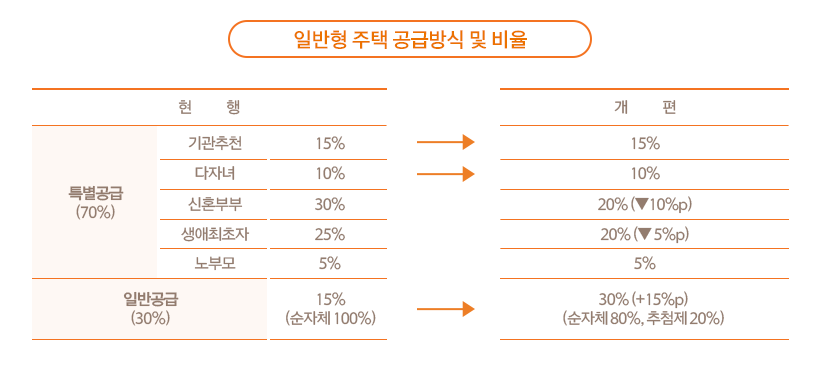 이번 일반형 공공분양에서 가장 눈에 띄는 부분은 기존 청약 제도를 개편하여 비중을 확대하고 추첨제를 신설했다는 점인데요. 그 동안 비율이 너무 적어서 소외 받았다고 평가되는 40~50대를 위해 공급 비중을 30%로 올렸으며 상대적으로 청약 횟수가 적을 수밖에 없는 청년층을 위해 20%의 추첨제를 신설했습니다.