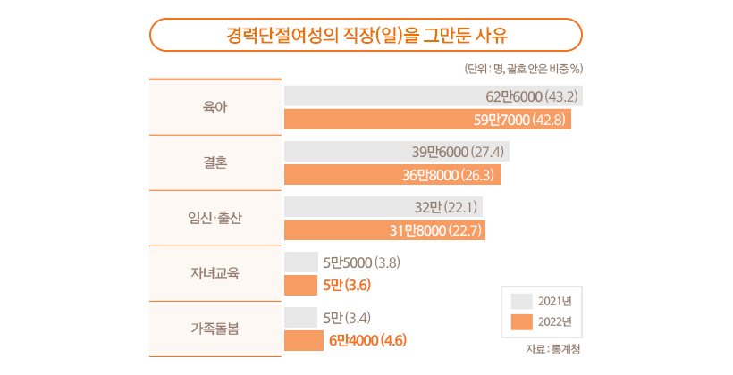 통계청 발표에 따르면 올해 상반기 여성의 경력 단절 이유 중 '육아'를 꼽은 사람이 59만 7,000명(42.8%)으로 가장 많았다고 합니다. 무려 여성 10명 중 4명의 경력 단절 원인이 육아였다는 이야기입니다.