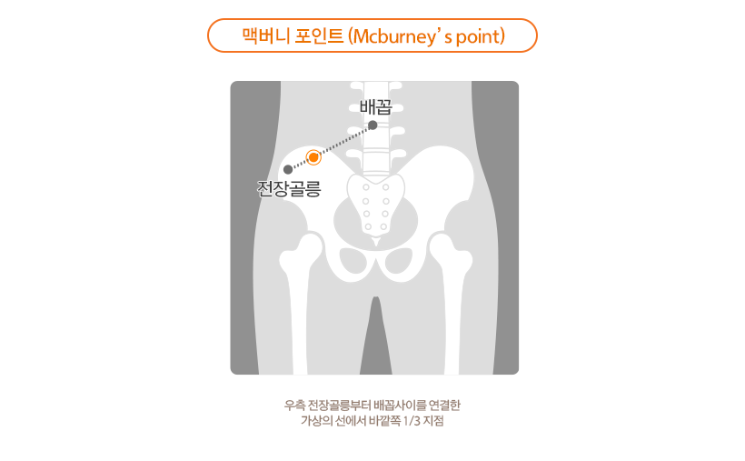 그 외에 일반 복통과 맹장염을 구분할 수 있는 방법이 하나 더 있는데요. 우측 골반뼈와 배꼽 사이에 있는 ‘맥버니 포인트’를 눌렀을 때 통증이 느껴진다면 맹장염일 가능성이 높다고 하니 이 점 참고하시면 좋을 것 같습니다.
