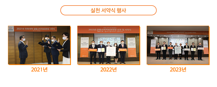 한화생명은 이러한 법률 제정에 선제적으로 대응하기 위해 2021년 3월 4일 <소비자보호헌장>을 개정하였는데요. 강화된 금융소비자보호에 대한 한화생명의 확고한 원칙을 선언하며 사내에서는 완전 판매 실천 의지를 다졌습니다. 임직원들은 행동 강령을 실천함으로써 소비자중심경영의 중요성을 다시 한번 되새기는 시간을 가졌습니다.