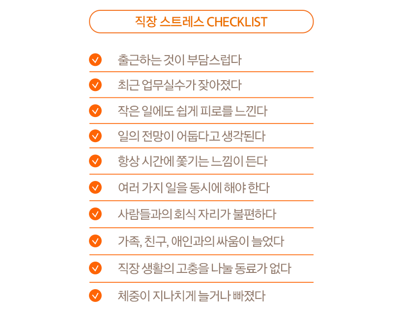자, 그렇다면 몇 가지 직장 스트레스 체크리스트를 통해 나의 직장 스트레스가 어느 정도 단계인지 확인해볼까요?