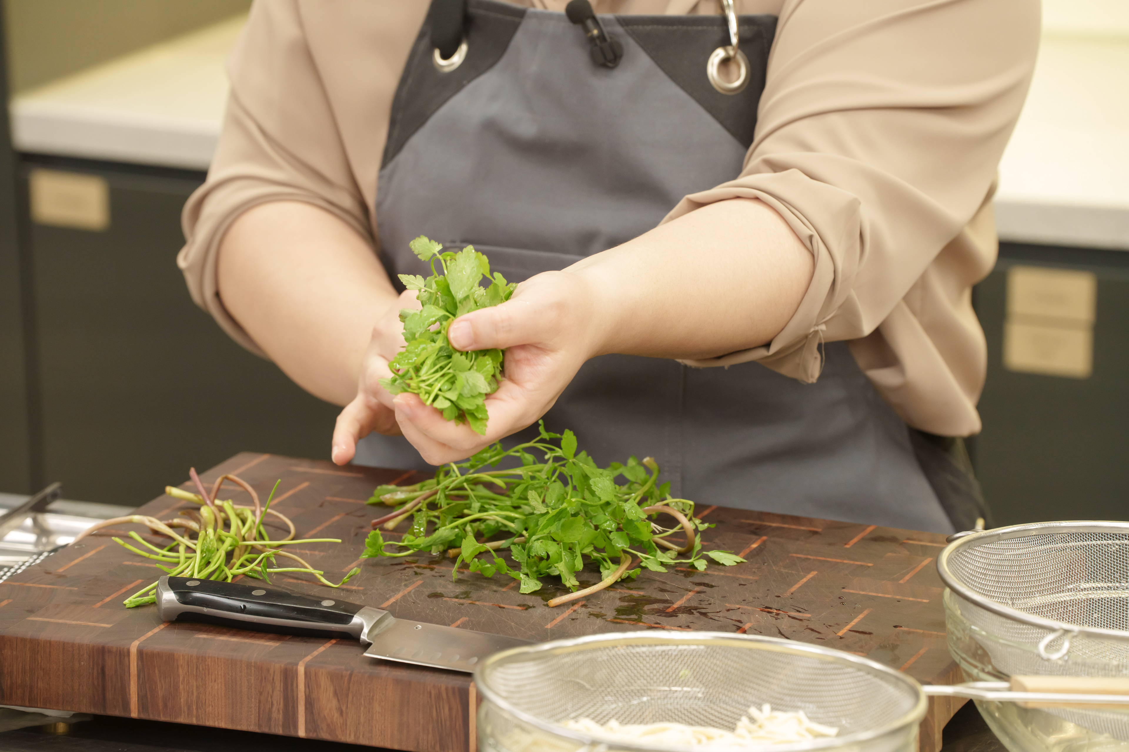 (줄기를 먼저 조리한 후, 잎 부분을 넣어야 각각의 식감을 제대로 살릴 수 있다.)