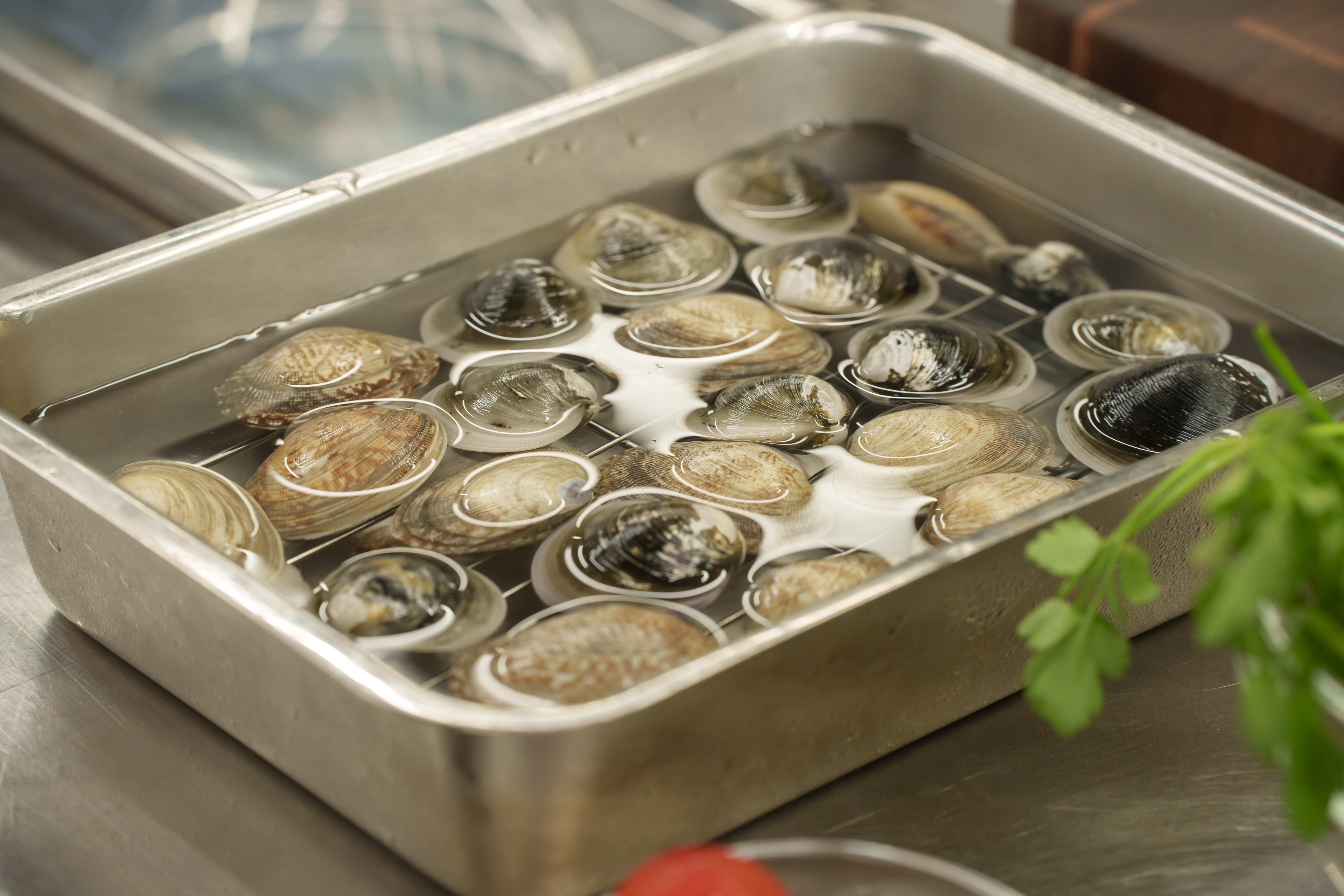 ④ ③의 조개들을 깨끗한 물에 두세 번 헹군 후, 채반에 받쳐 준비한다.