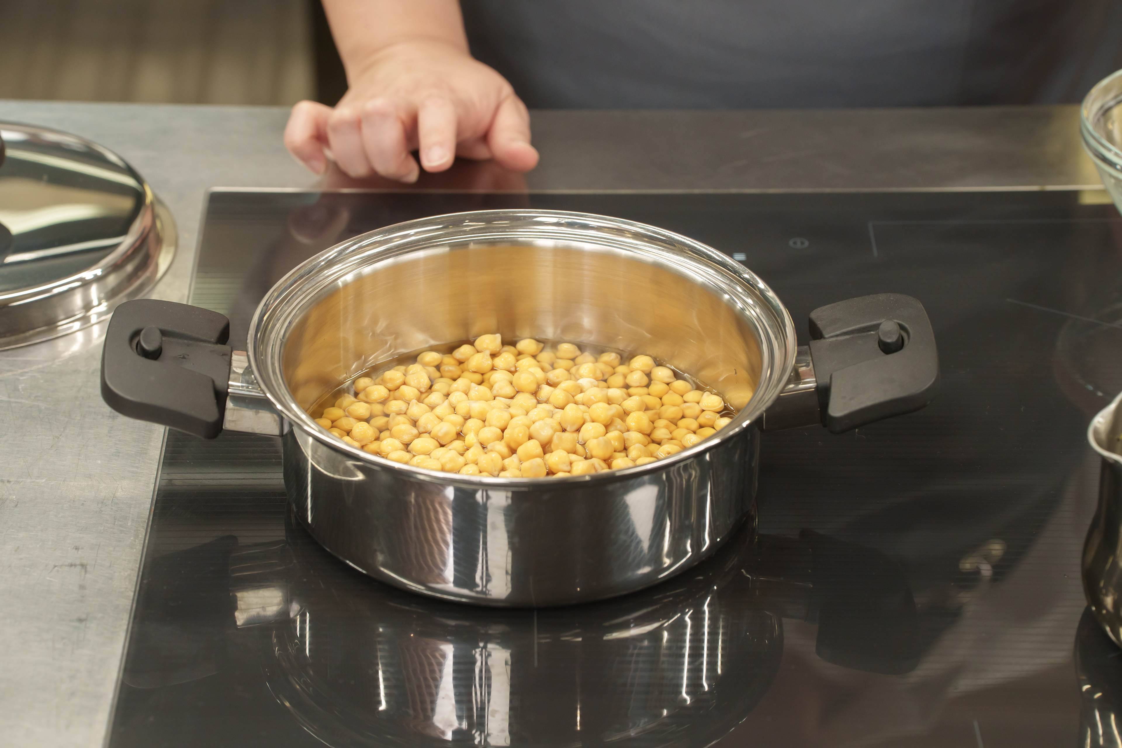 ② 불린 물과 함께 병아리콩을 냄비에 부어15~20분간 삶는다.