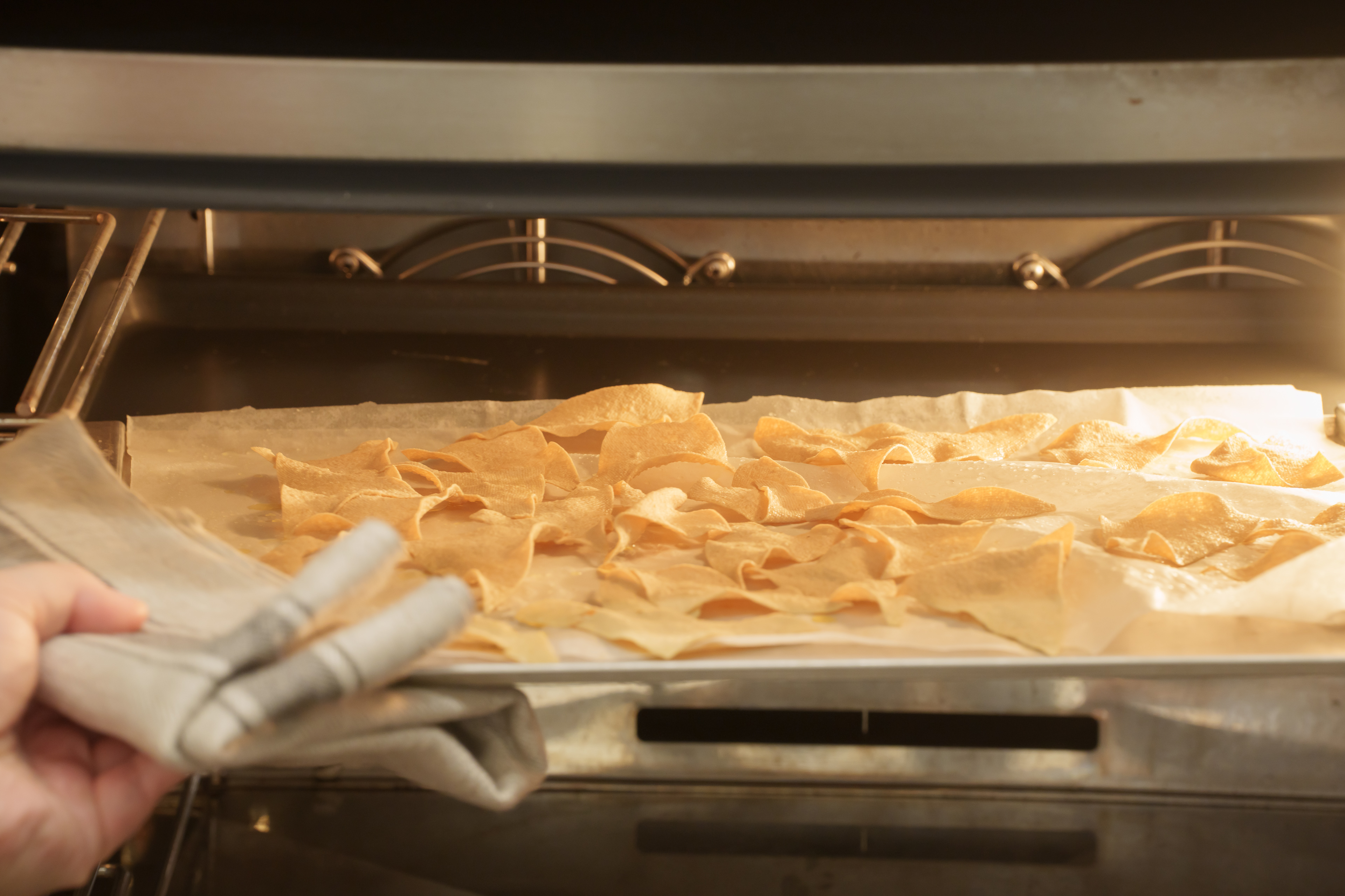 ③ 오븐용 사각 팬에 겹치지 않도록 ②를 골고루 펼쳐주고, 170~180도로 예열된 오븐에서 10분 정도 노릇하게 익혀준다.
