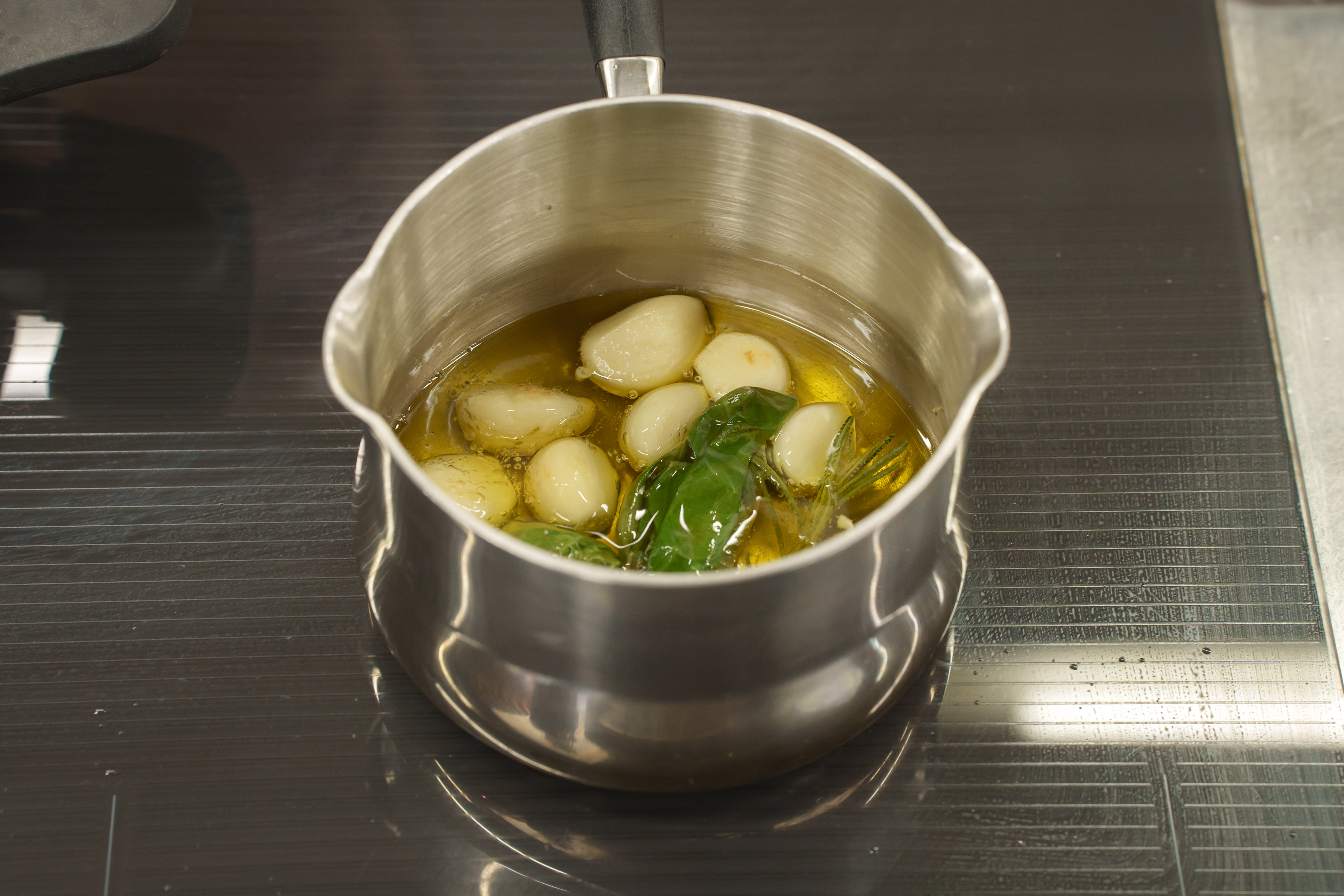 ① 작은 팬에 마늘과 바질과 로즈메리가 잠길 만큼 올리브 오일을 붓는다.