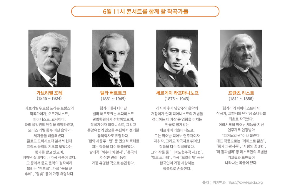 한층 뜨거워진 햇빛에 녹음이 어우러져 우리의 마음도 싱그러워지는 계절을 맞아, 6월 11시 콘서트에서는 청량한 날씨에 맞는 다양한 클래식을 준비했습니다. 6월 11시 콘서트로 초여름 밤의 한 줄기 바람같은 시원한 휴식을 즐겨보세요:)