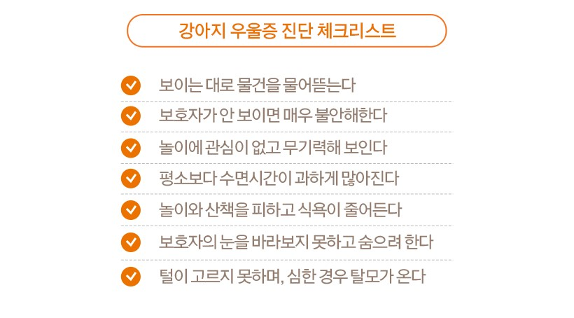 강아지는 상황에 따라 몸짓이나 표정, 행동 들을 통한 카밍 시그널(Calming Signals)로 자신의 상황이나 상태를 드러내곤 하는데요. 위의 의심 증상 중 2~3개 이상 해당된다면 우울증이 아니더라도 다른 건강상의 문제가 있을 수도 있습니다. 반려견에게 위의 증상들을 보인다면 강아지의 행동을 조금 더 유의 깊게 살펴볼 필요가 있습니다.