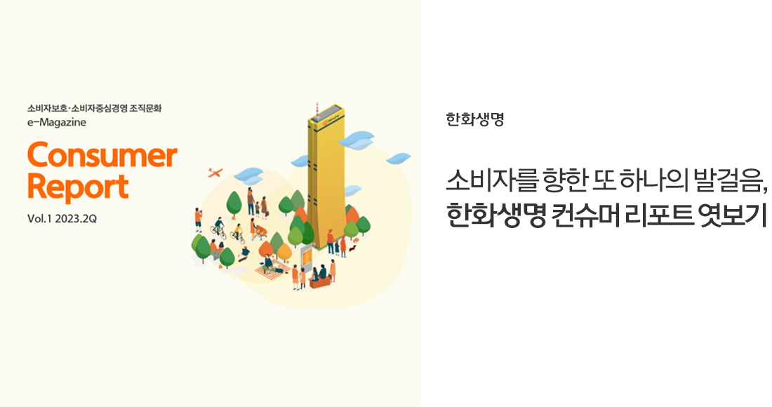 그 동안 전해드린 많은 소식으로 한화생명이 금융소비자 권익 증진과 소비자경험의 개선을 최우선 가치로 삼는 기업이라는 것을 알고 계실 텐데요. 한화생명 소비자보호실에서는 소비자 보호·소비자 중심경영의 조직문화를 만들어가기 위해서 분기별로「컨슈머 리포트」를 발행해 임직원들과 공유하고 있습니다.