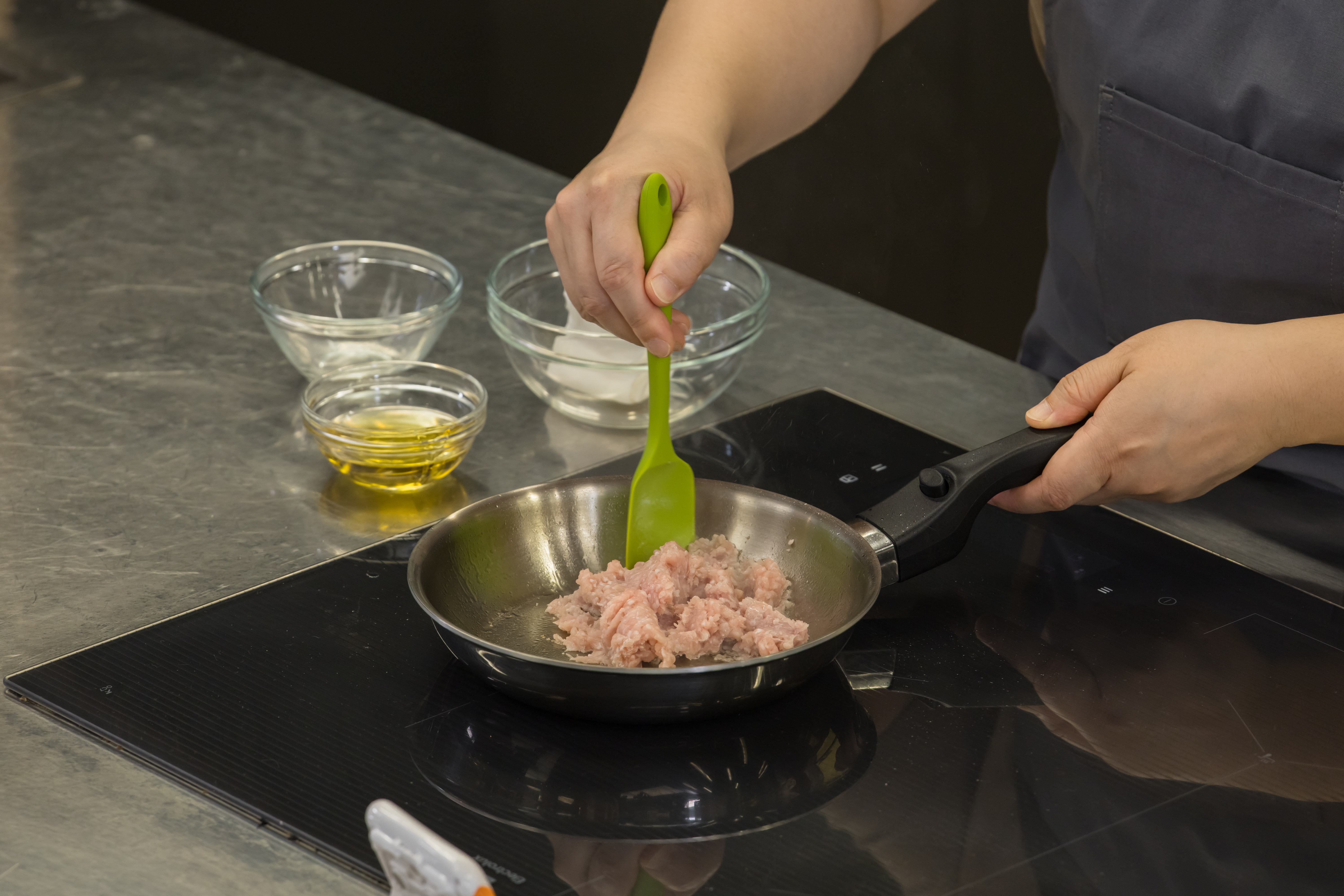① 팬을 달구어 아보카도 오일을 1작은술 두르고 돼지고기 간 것과 다진 마늘, 다진 대파, 다진 생강을 넣고 볶다가 소금과 후추로 밑간 한다.