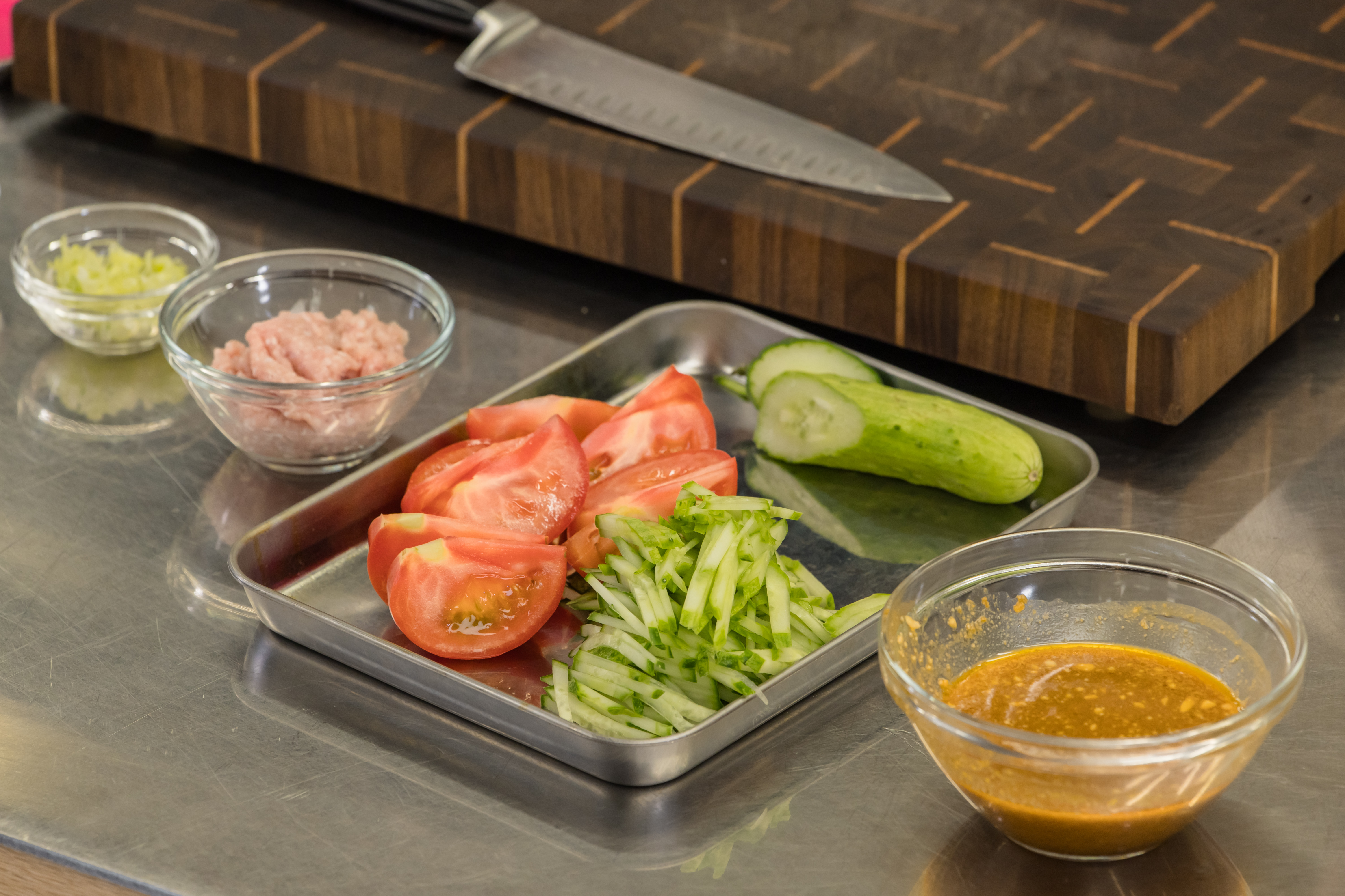 ③ 오이는 채 썰고, 토마토는 한입 크기로 썰어 고명을 준비한다.