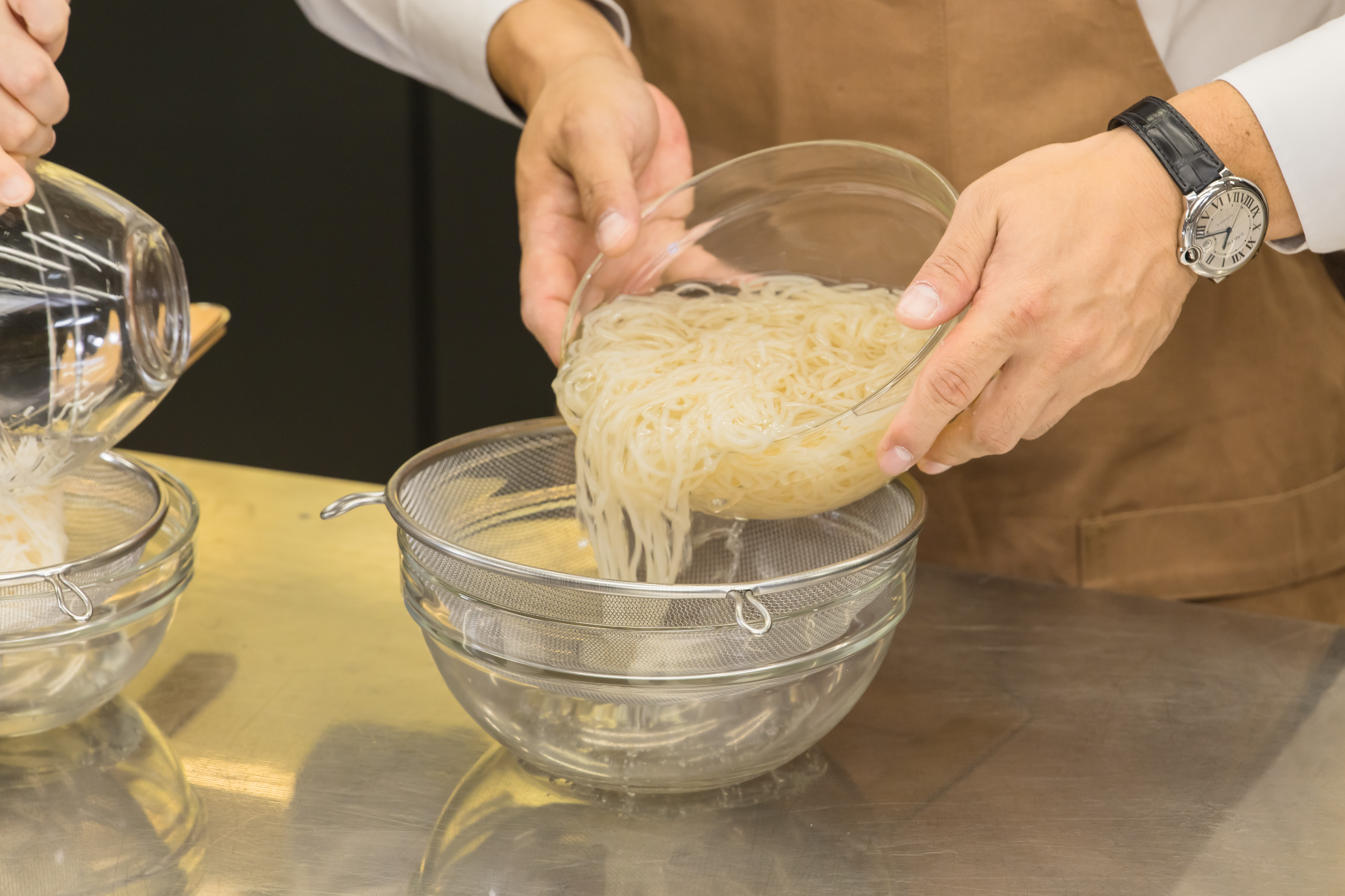 ① 콩담백면은 물로 헹궈 채반에 밭쳐 물기를 뺀다.