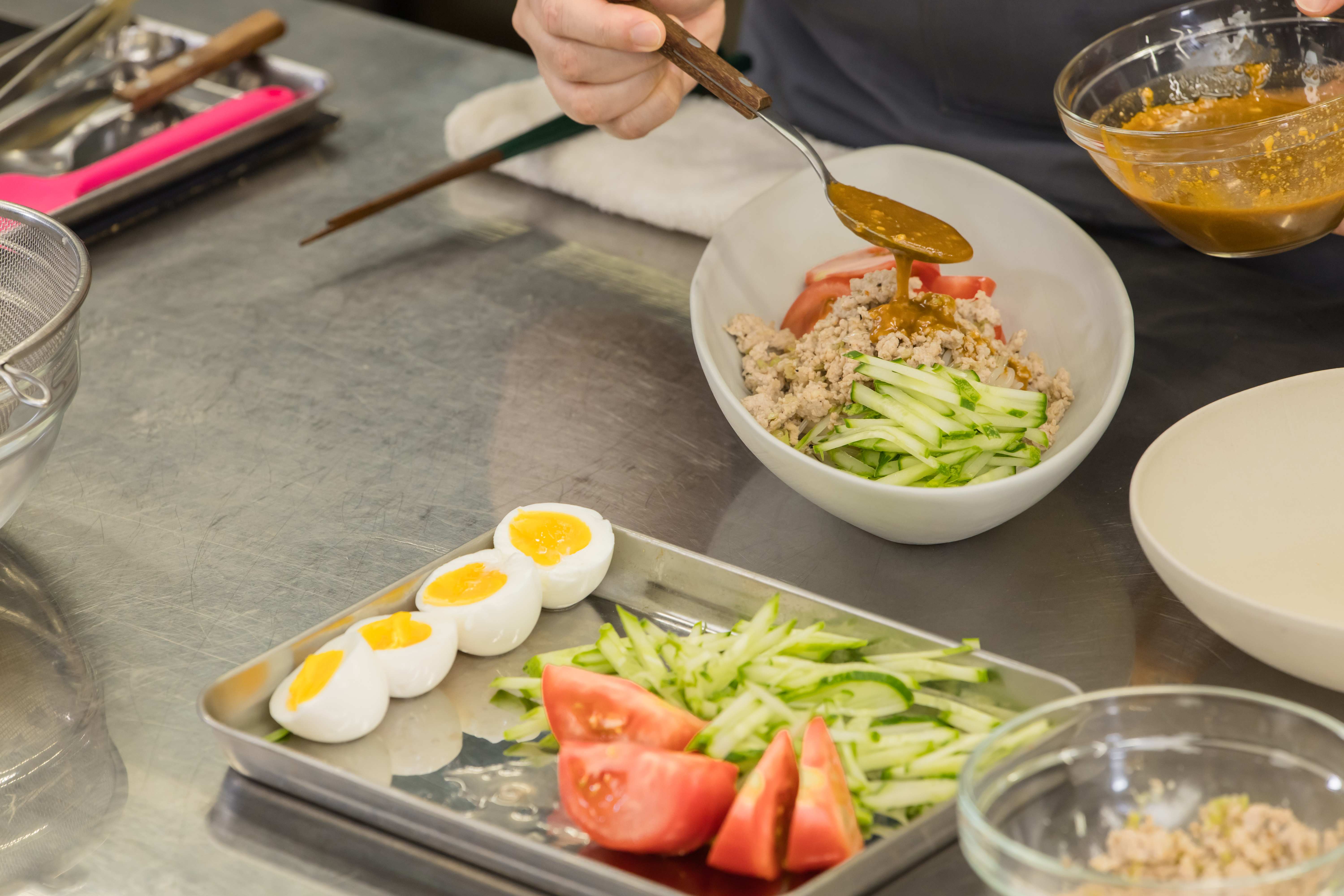 ② 그릇에 재료를 돌려 담고, 땅콩비빔소스를 뿌려 비벼 먹는다.