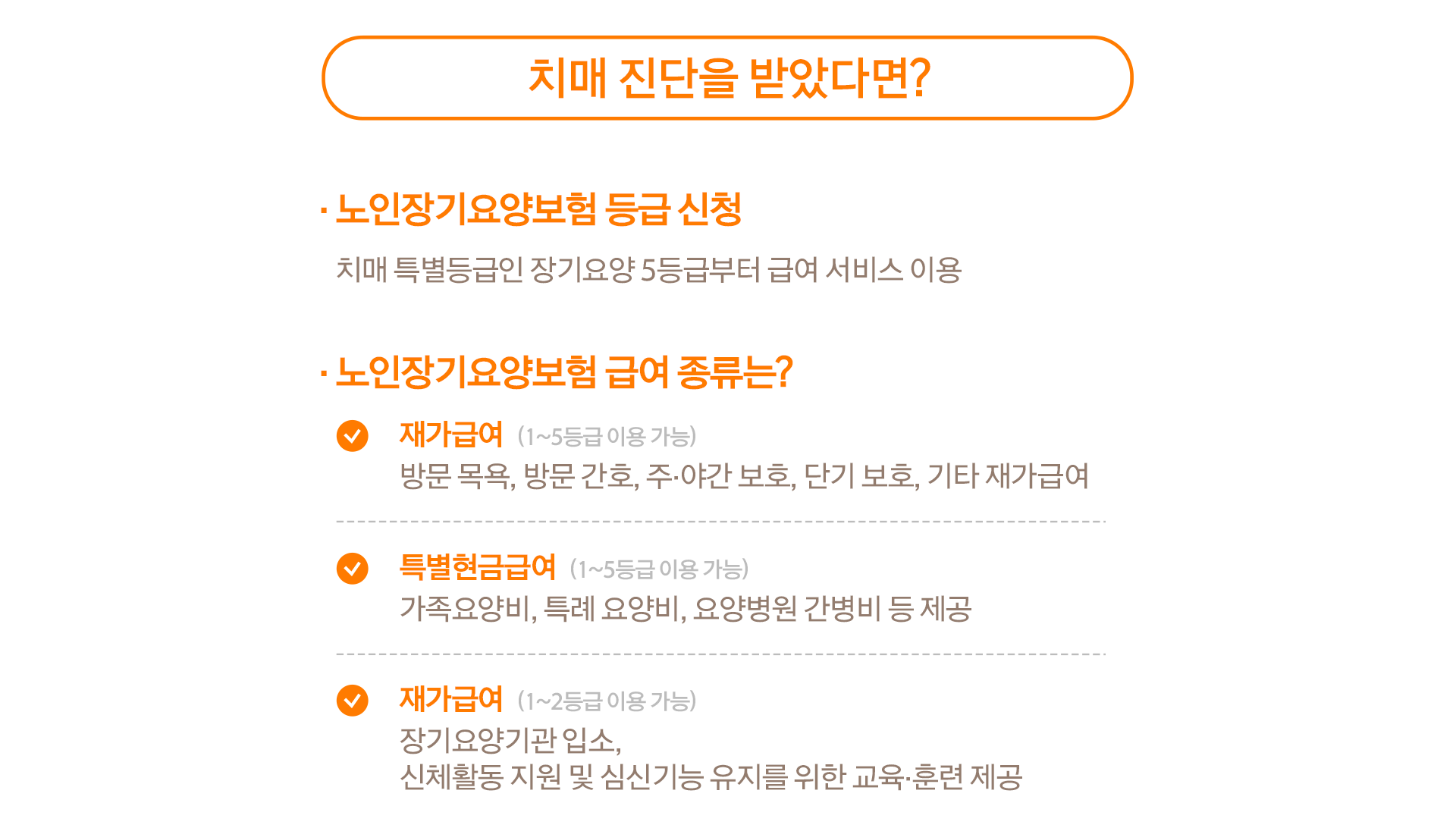 * 재가급여: 치매, 노인성질환으로 노인장기요양등급 1~5등급을 받은 재가 노인에게 장기요양보험에서 방문 요양, 방문 목욕, 방문 간호, 주야간 보호 등 서비스를 제공해 주는 노인장기요양 급여 종류