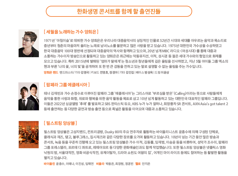 한화생명 콘서트는 지방의 문화예술 저변을 넓히고자 한화생명에서 2004년부터 꾸준히 이어오고 있는 음악 여정으로, 예술성과 대중성을 겸비하여 매년 대중으로부터 뜨거운 호응을 받아왔습니다. 팬데믹 속에서도 계속되었던 한화생명의 음악 여행은 2021년에 '이날치'와 함께한 퓨전 판소리의 흥겨운 가락으로 힘든 시기에 서로를 응원했고, 2022년에는 인순이와 오케스트라가 빚어낸 열정적인 무대로 새롭게 펼쳐질 삶과 다시 피어날 꿈을 노래했습니다. 올해는 감동적인 울림을 전하는 양희은이 노래와 함께 진솔한 삶의 이야기를 전할 예정인데요. 이에 더해 팝페라 그룹 에클레시아와 필스트링 앙상블, 양희은 밴드가 함께 전하는 선율로 지쳤던 모두의 마음을 따뜻하게 어루만지는 무대로 채워질 예정입니다. 이번 공연으로 유난히 다사다난했던 한 해의 아픔을 이겨내는 작은 응원을 담아 음악을 통한 위로와 공감을 나누는 치유의 희망을 전하려 합니다.