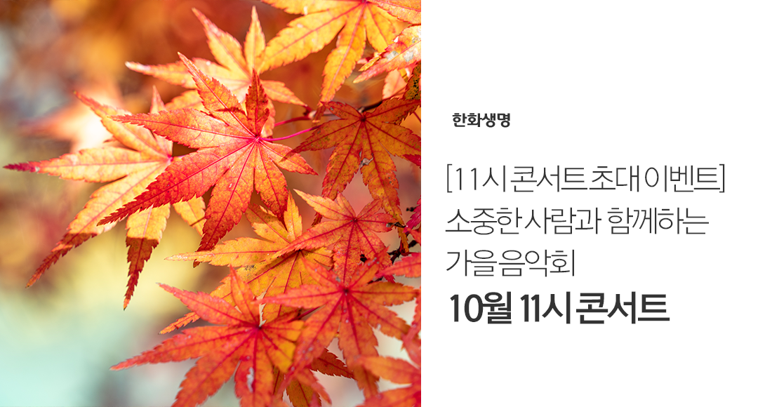 가을빛으로 물든 분위기 있는 클래식이 가득한 ‘한화생명과 함께하는 예술의 전당 10월 11시 콘서트’와 함께 소중한 사람과 가을날의 추억을 만들어 보는 것은 어떨까요?