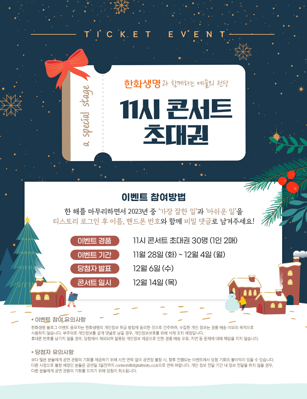 성큼 다가온 연말, 그동안 마음을 전하고 싶었지만 미처 말하지 못했던 소중한 분이 있다면 이번 12월에는 한화생명 12월 11시 콘서트에서 아름다운 클래식과 함께 마음을 전해 보는 것은 어떨까요?