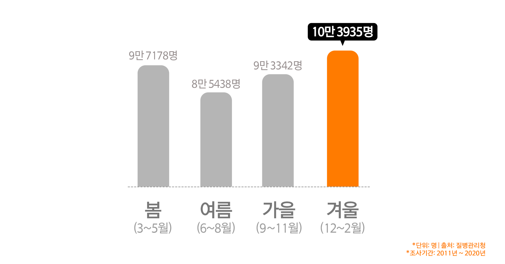 겨울철에 급격하게 증가하는 심뇌혈관질환의 경우, 발생 시 사망에 이를 수 있으므로 사전에 반드시 예방하는데 주의를 기울여야 합니다.