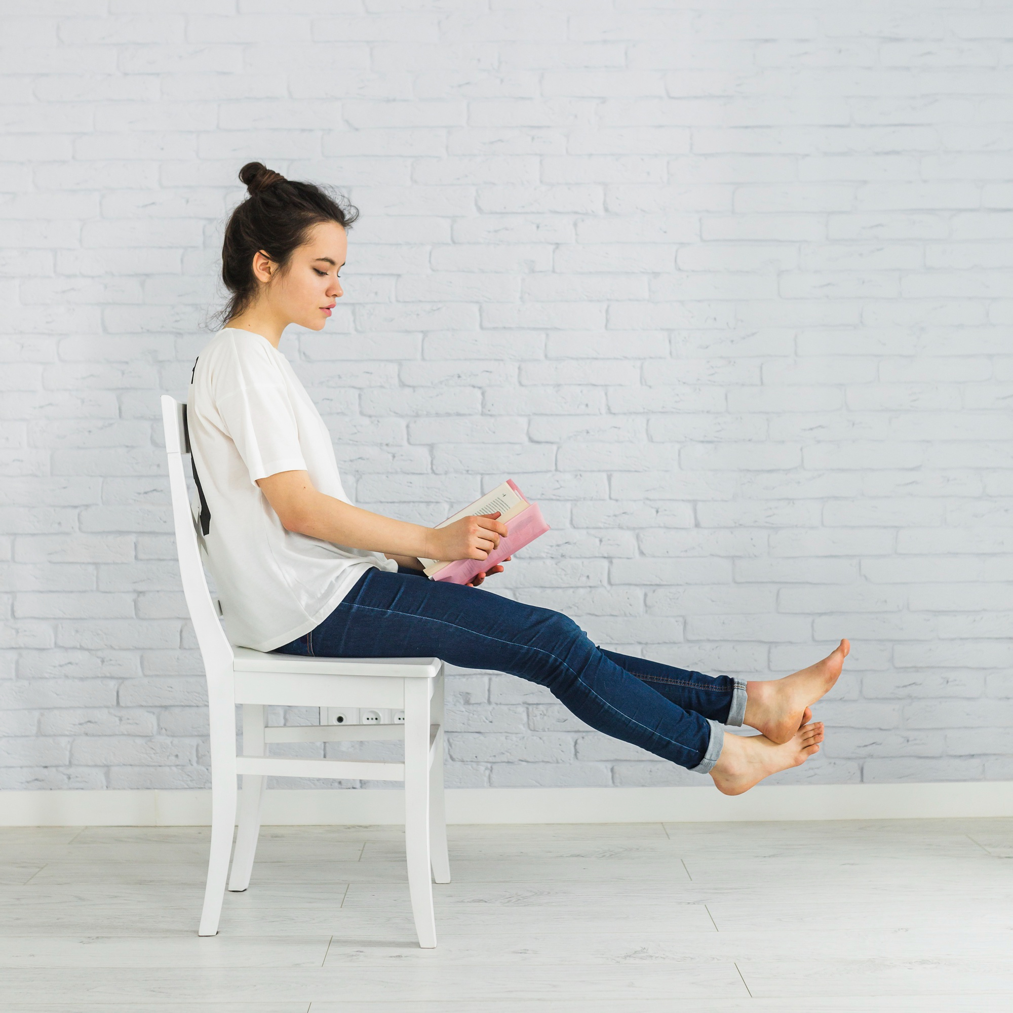 의자에 앉아 바닥에 발을 대고, 한쪽 다리를 앞으로 길게 뻗어 2초간 유지합니다. 각 다리마다 15번씩 반복합니다. 당기는 정도는 종아리와 허벅지 뒷부분이 조금 당길 정도면 됩니다. 다리를 일직선으로 최대한 뻗는 게 좋지만 유연성이 부족할 경우 무리해서 당기지는 않도록 주의해주세요!