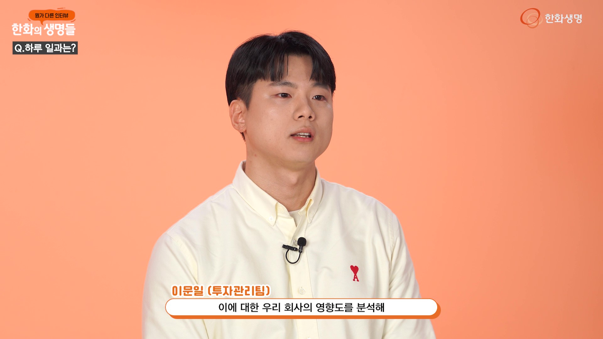 투자관리팀 이문일 대리 : 금융시장, 경제 동향 등을 분석 후 종합적인 판단을 통해 투자 여부를 결정하는 리스크 관리자 역할을 하는 직무입니다.