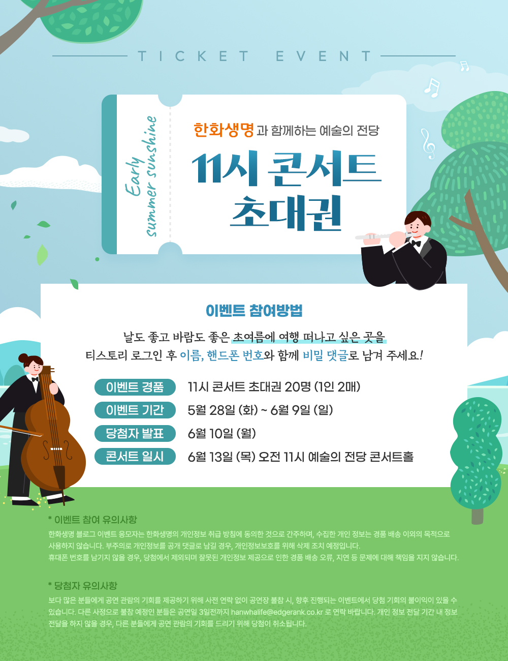 어느 새 완연한 초여름이 되었습니다. 아침에 일어나면 햇살이 밝아 눈이 부시기도 하는데요. 이렇게 맑은 아침에는 귀를 즐겁게 해 줄 클래식 공연이 그리워집니다. 좋은 날씨만큼 마음이 들뜨는 초여름, 한화생명 6월 11시 콘서트와 함께해보시는 건 어떨까요?