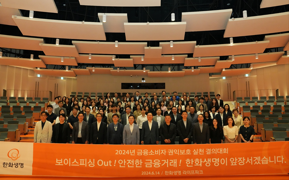 지난 6월 14일, 용인 라이프파크에서 소비자 접점 채널과 부문별 대표 임직원 100여명이 참석한 가운데 ‘금융소비자 권익보호 실천 결의대회’가 열렸는데요. 이 날 결의대회는 급증하는 보이스피싱 범죄에 대한 인식을 제고하고, 소비자권익 보호가 최우선 가치라는 점을 다짐하는 자리였습니다. 한화생명 조현호 CCO(소비자보호총괄책임자)는 이 자리에서 보이스피싱 사례 및 근절 대책을 발표하고 금융소비자 권익 보호 방향을 공유했습니다. 임직원들 역시 전자금융사고 예방과 사고 방지책 홍보에 앞장서고, 안전한 금융거래를 위해 최선을 다하겠다는 결의문을 낭독했는데요. 조현호 CCO는 “앞으로도 보이스피싱 피해를 예방하며 금융소비자의 권익 보호를 위해 적극적으로 앞장서겠다”고 말했습니다.