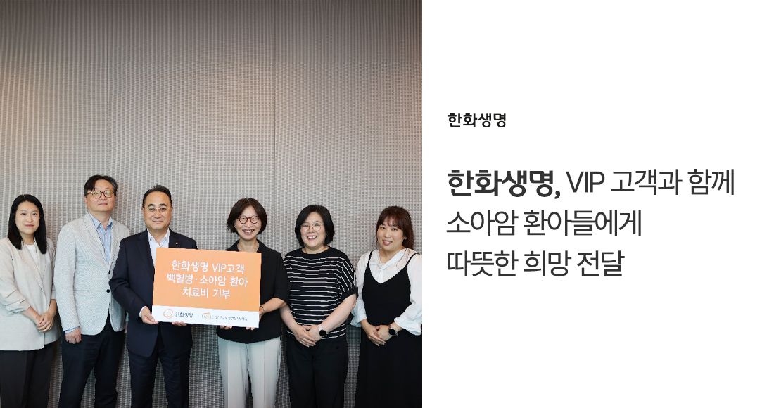 지난 6월 27일, 한화생명에서는 VIP 고객들의 참여로 함께 모은 후원금을 소아암으로 투병 중인 환아들에게 전달하는 특별한 행사가 진행되었습니다. 2014년부터 매년 이어져 온 기부금 전달식은 소아암 환아들의 완쾌를 기원하고, 치료 후의 사회 복귀를 응원하는 마음을 담아 진행되고 있습니다.