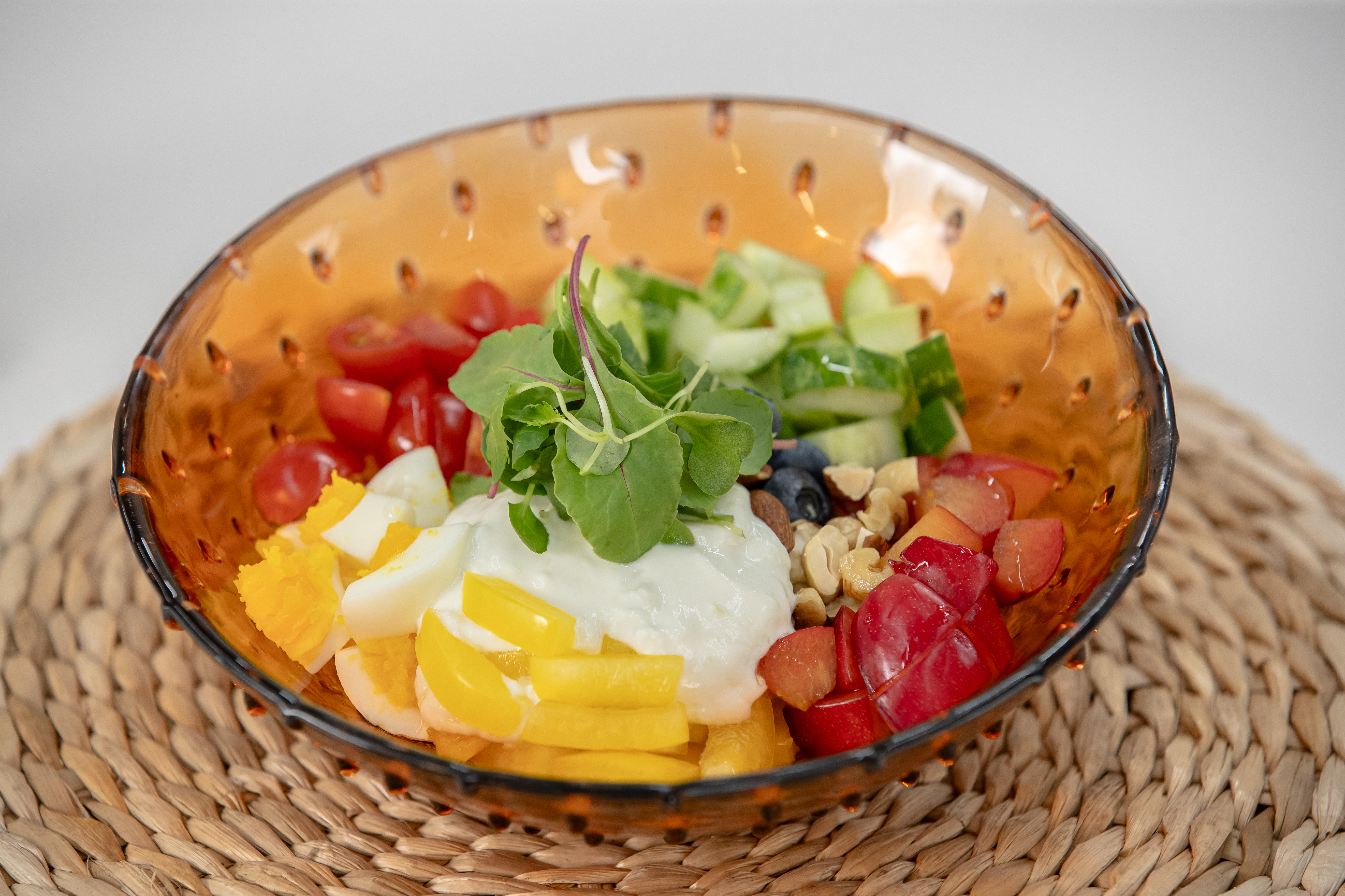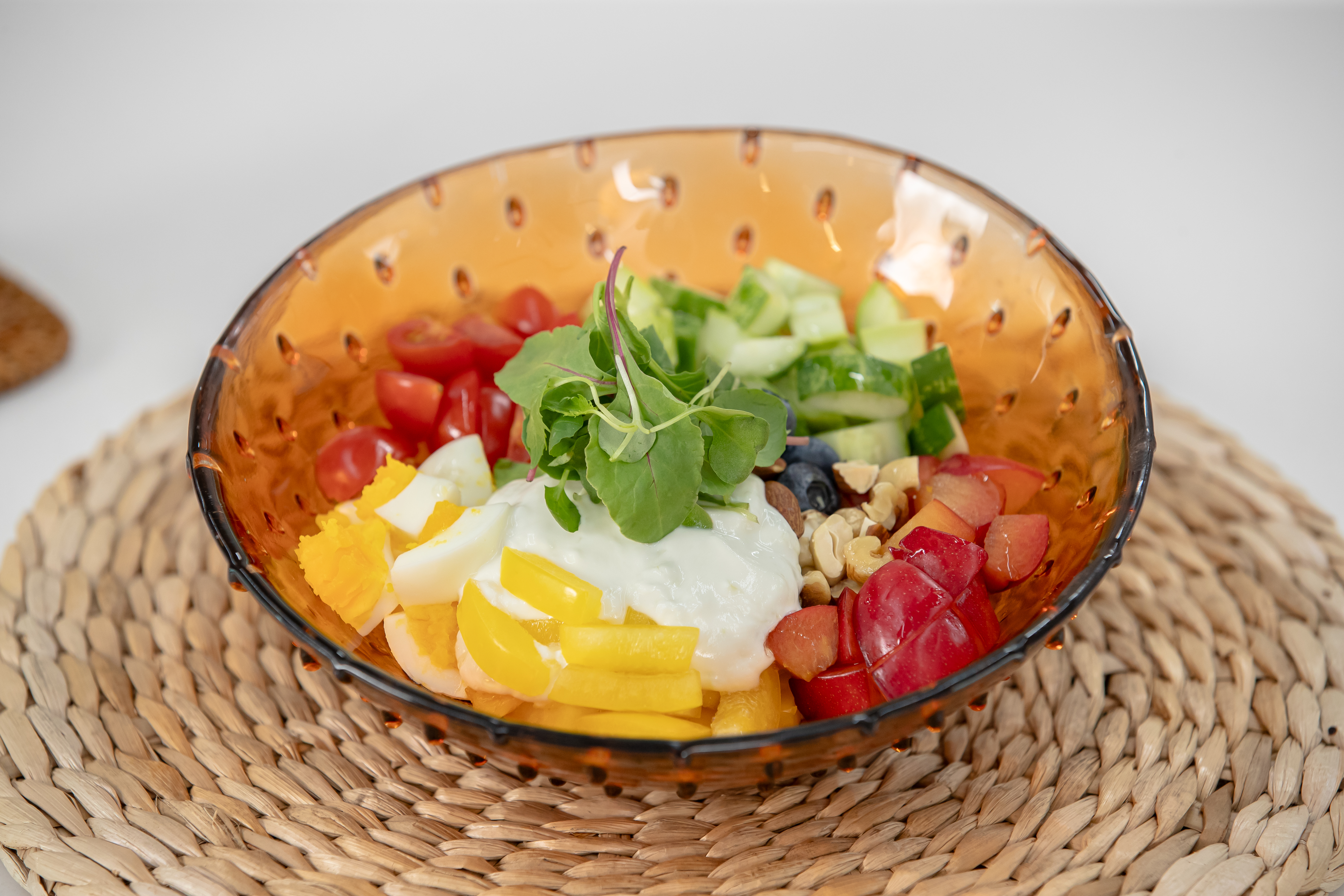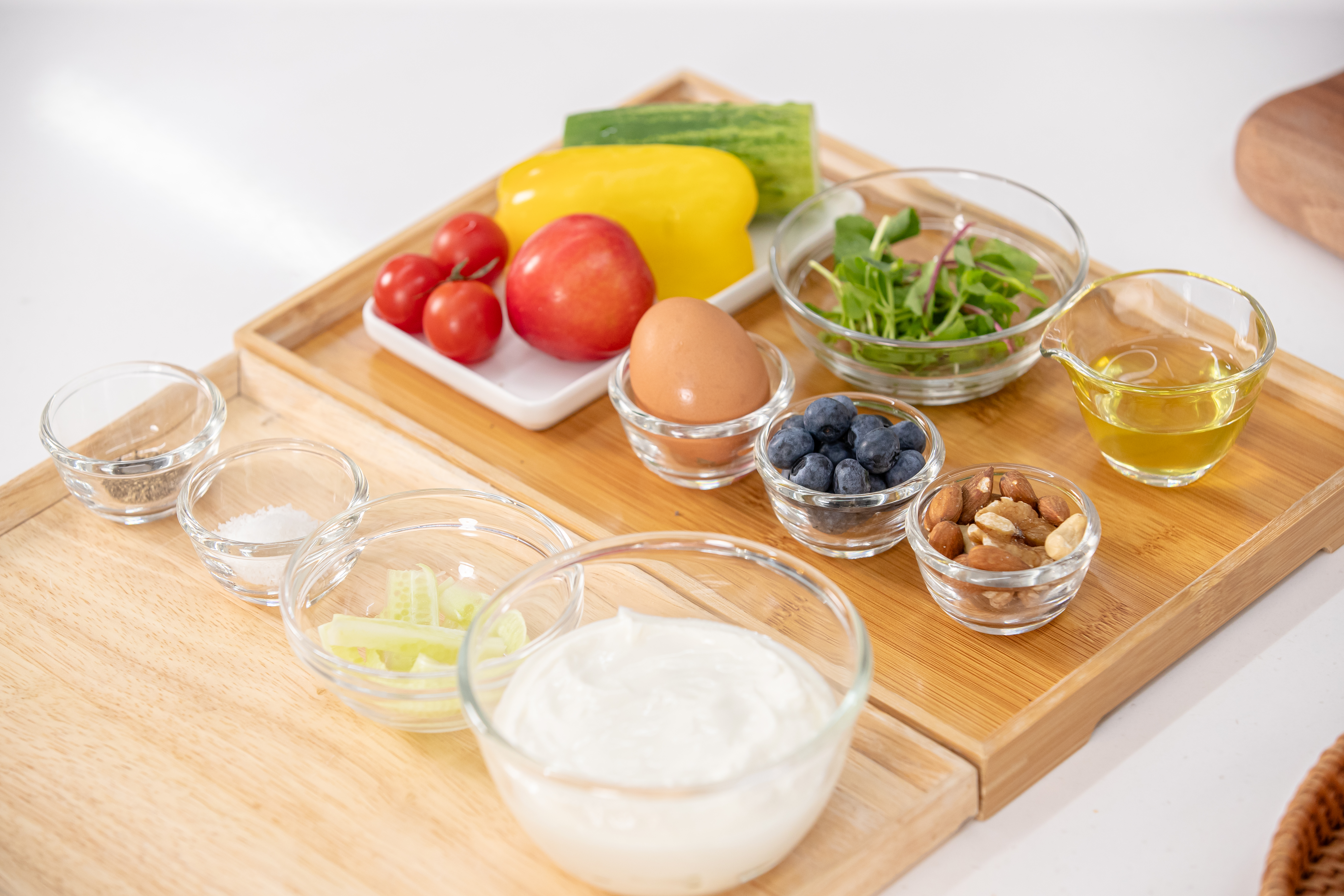 달걀 1개, 오이 80g, 파프리카 1/4개(50g), 제철 과일 약간(자두, 사과, 방울토마토, 블루베리 등), 견과류 한 줌, 올리브오일 2작은술, 베이비 채소 약간