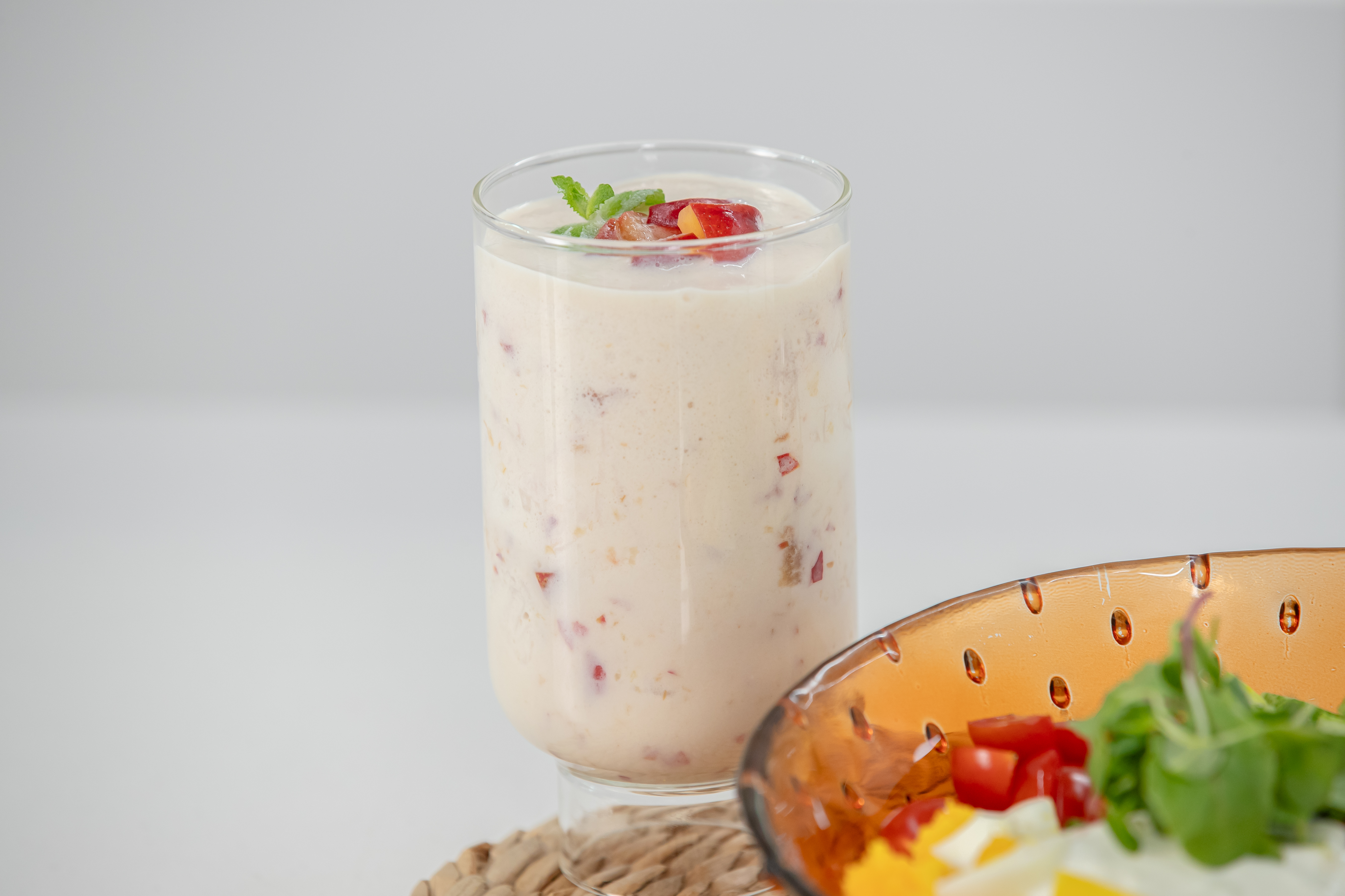④ 잘 갈린 자두청 라떼를 컵에 담고, 기호에 따라 자두 과육이나 애플민트를 추가하면 자두청 라떼 완성!