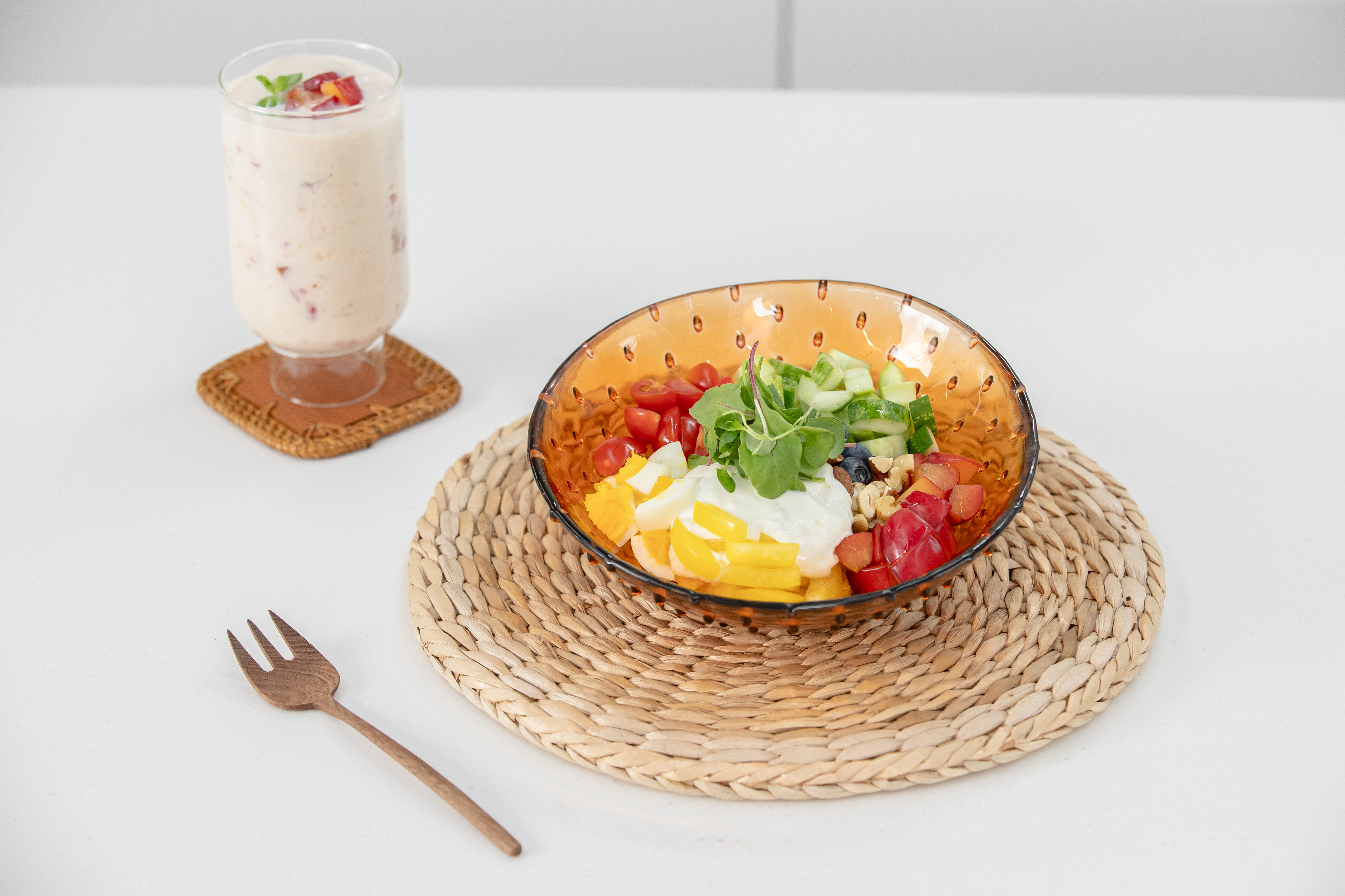 탄단지 헬시볼과 자두청 라떼, 두 가지 메뉴가 완성되었습니다. 채소가 많아 영양 가득하고, 혈당도 급격히 올라가지 않아 아침 식사로 제격이죠? 당뇨 환자를 대상으로 한 실험에서, 채소를 먼저 먹을 경우 식후 혈당이 천천히 올라가고 과식 방지에도 도움이 되었다는 연구 결과가 있다고 합니다. 이처럼 혈당 조절을 위해 헬시볼을 먹을 때에는 채소를 먼저 먹는 것을 추천 드립니다.