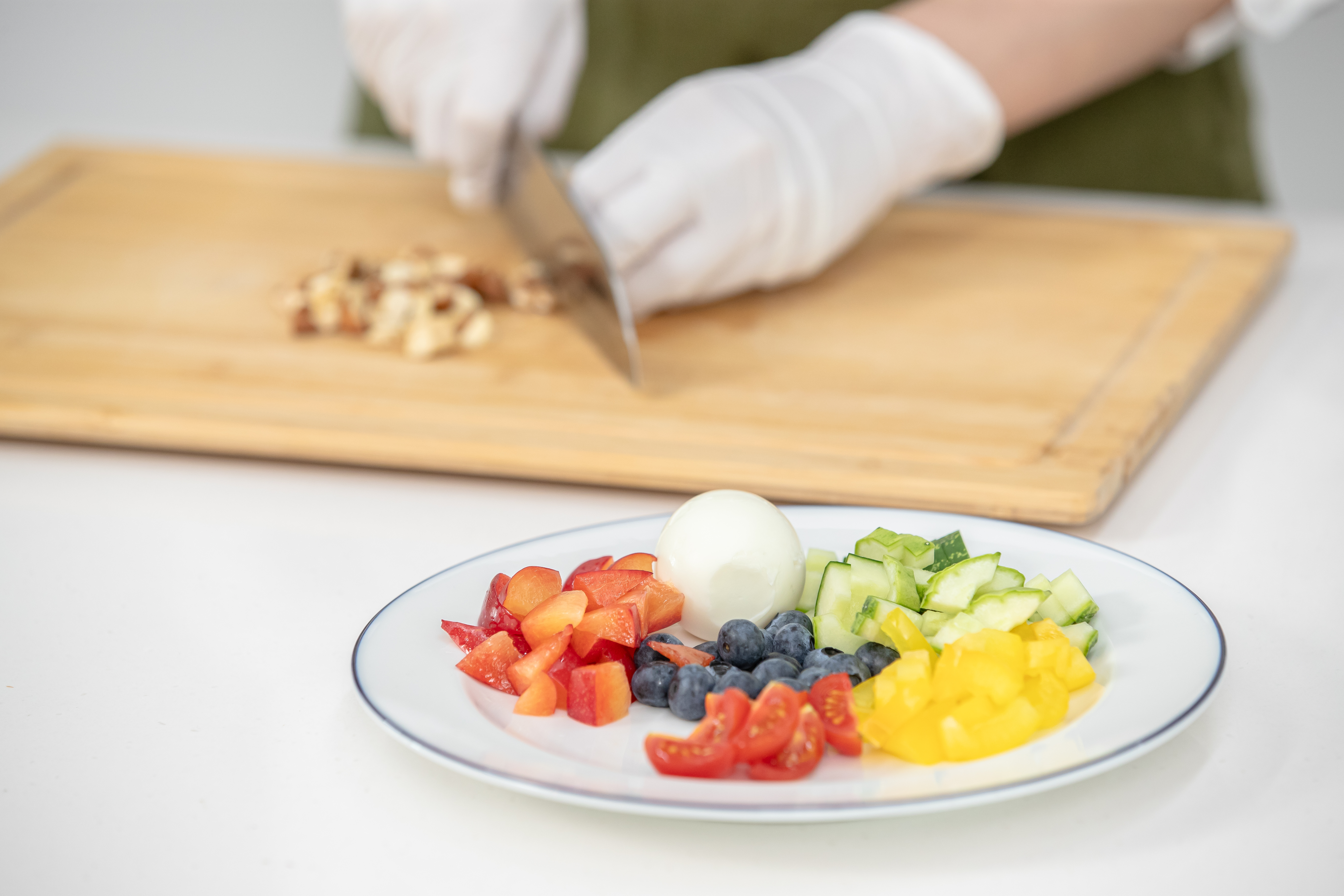 먼저 오늘은 견과류가 들어간 아침 식사로 탄단지 헬시볼을 준비했습니다. 탄단지 헬시볼에는 탄수화물, 단백질, 건강한 지방이 모두 들어가 있는데요. 첫 번째로 블루베리, 자두, 방울토마토 등 제철채소와 과일을 사용해 탄수화물을 챙겼습니다. 특히 제철채소 중 블루베리는 안토시아닌과 폴리페놀 등 강력한 항산화 물질이 들어있고 다양한 비타민과 미네랄이 풍부해 항염 작용과 면역력 향상에 좋은 슈퍼푸드입니다.