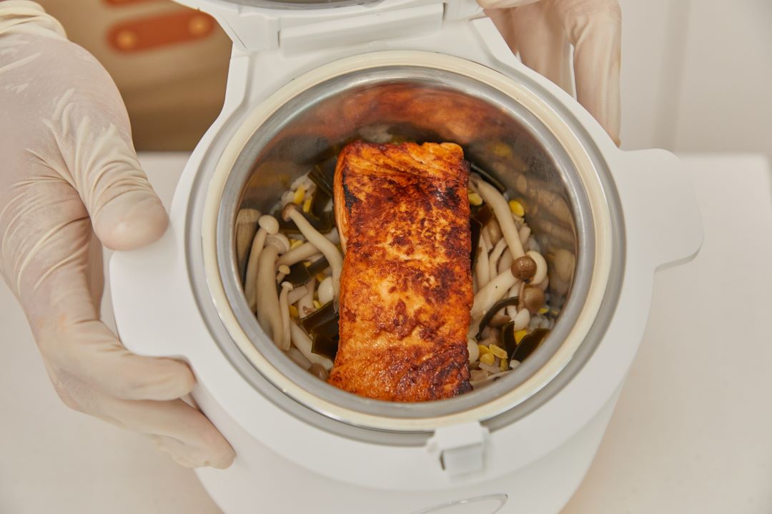 ⑤ 밥솥에 구운 연어를 넣고 약 10분간 더 익혀 줍니다.