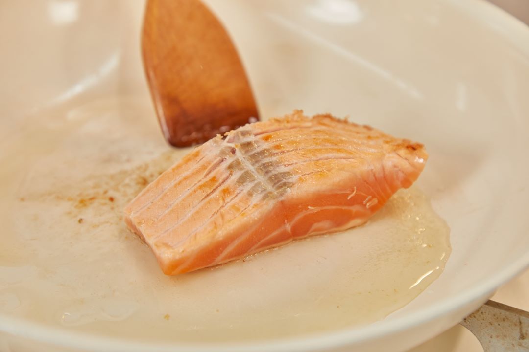 ④ 예열된 팬에 기름을 약간만 두르고 연어를 올려 적당히 익혀 주세요.