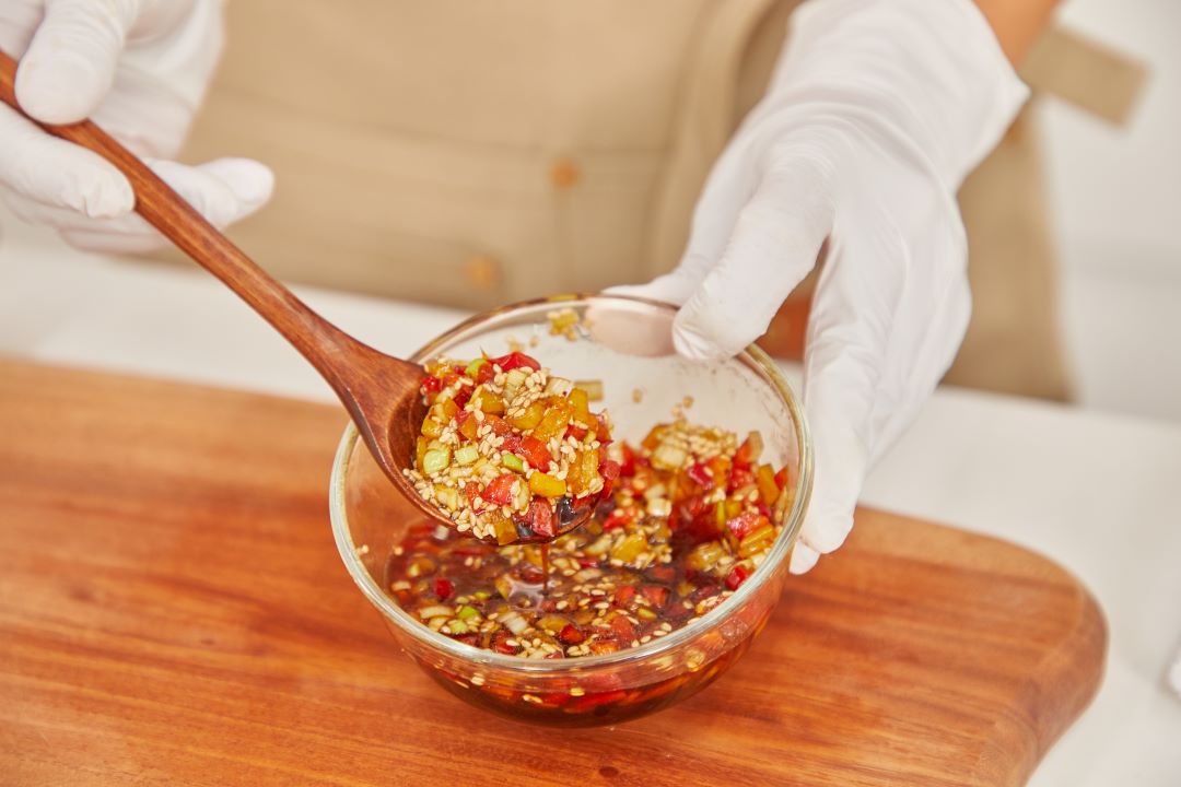 Tip 양념장의 채소들이 식감을 돋을 수 있도록 적당히 다듬어 주시는 것을 추천해요! 파프리카는 항산화 물질이 풍부해 항암, 항염에 좋은 채소입니다.