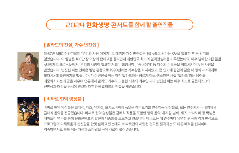 이번 공연에서는 가수 변진섭의 음악 인생을 바싸르 현악 앙상블의 개성 있는 편곡과 함께 진행할 예정입니다.