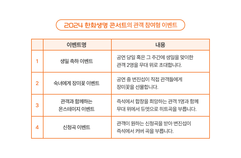 2024 한화생명 콘서트에는 관객 참여형 이벤트가 준비되어 있습니다. 생일 축하 이벤트부터 숙녀에게 장미꽃 이벤트, 관객과 함께하는 온스테이지 이벤트, 신청곡 이벤트까지 다양한 즐길거리를 변진섭과 함께 즐겨보세요.