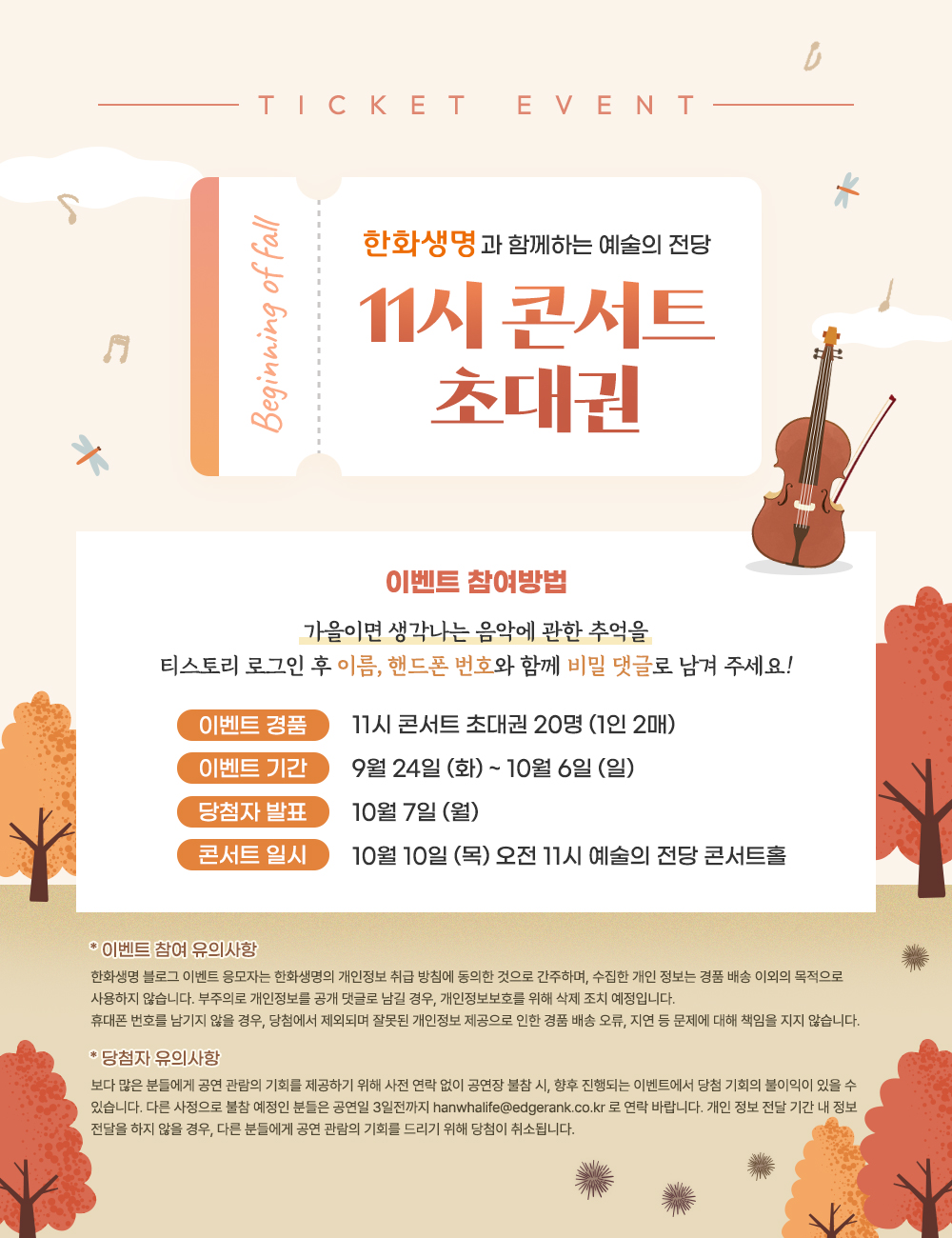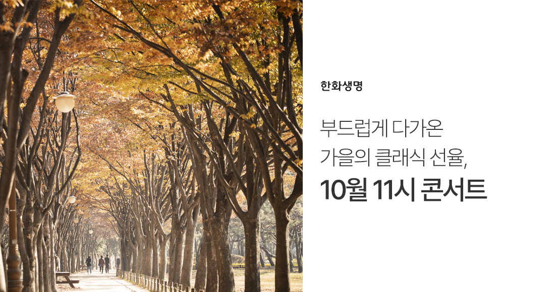 긴 더위가 지나가고 드디어 가을다운 가을이 시작되었는데요. 지금 이 가을처럼 감성과 낭만 가득한 하루를 보내고 싶은 분이라면, 한화생명과 함께하는 예술의 전당 11시 콘서트에 많은 관심 부탁드립니다!