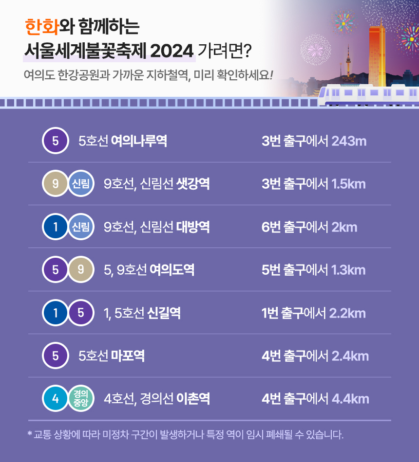 서울세계불꽃축제가 열리는 여의도 한강공원과 가까운 지하철역을 미리 확인하세요!